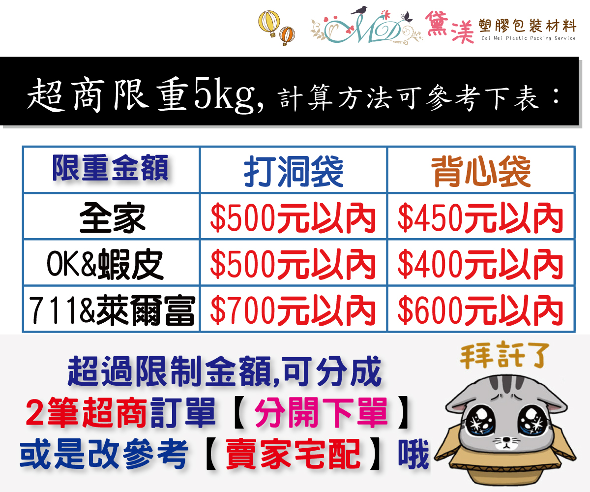 備註:超商限重5公斤,塑膠$100=1公斤,單筆訂單勿超過$600元,或是分成兩筆超商訂單下標亦可參考賣家宅配(不限金額),我們也有提供宅配貨到付款哦~謝謝^^