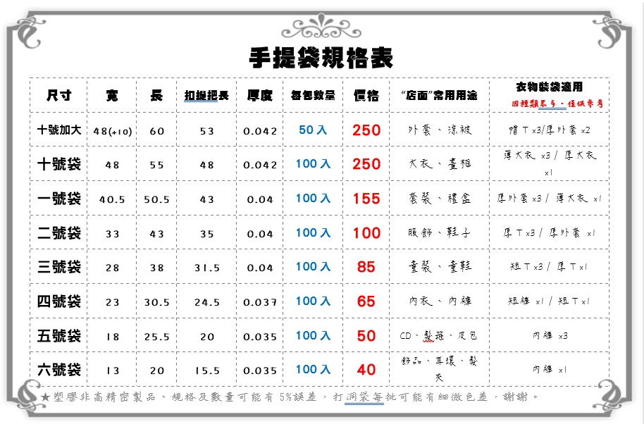 ♣塑膠袋皆為實品拍攝,因非高精密製品,尺寸規格約有5%誤差,每批可能有些許色差。