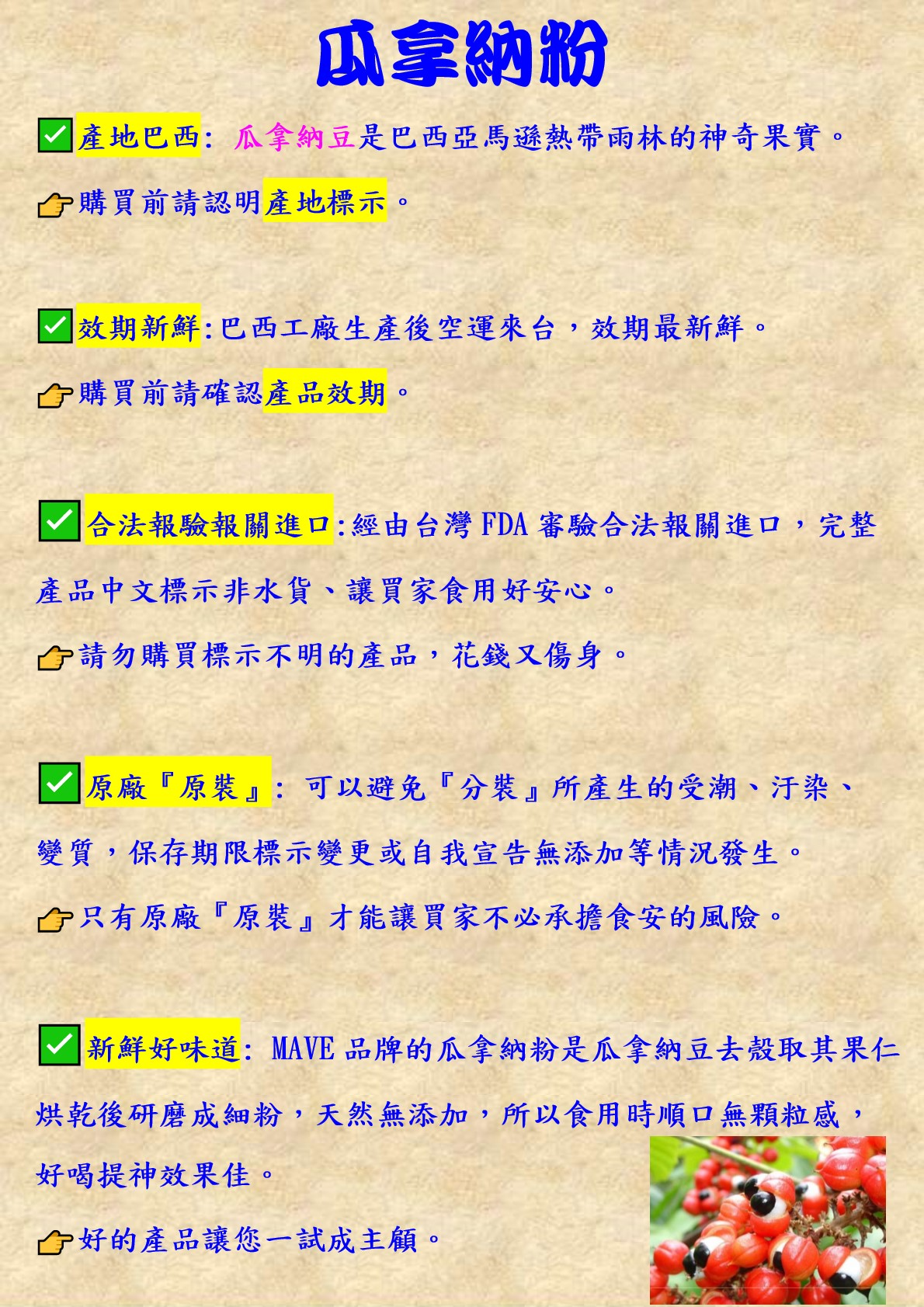 *食用瓜拿納能使精神旺盛,如會影響睡眠,盡量不要在晚間食用。