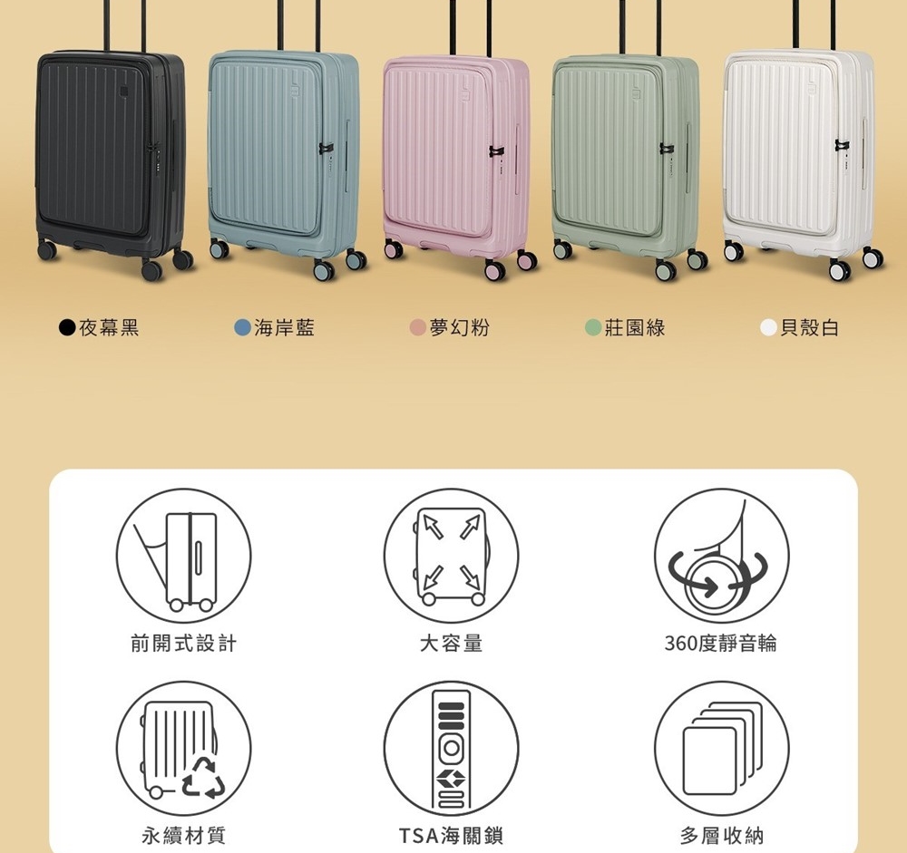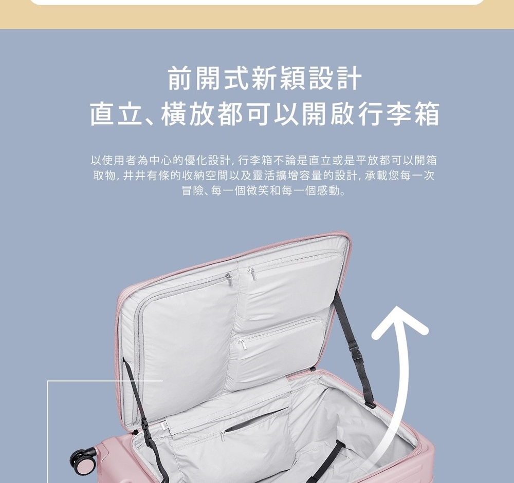 以使用者為中心的優化設計,行李箱不論是直立或是平放都可以開箱取物,井井有條的收納空間以及靈活擴增容量的設計,承載您每一次冒險、每一個微笑和每一個感動。