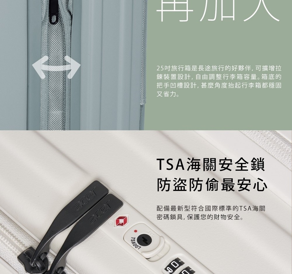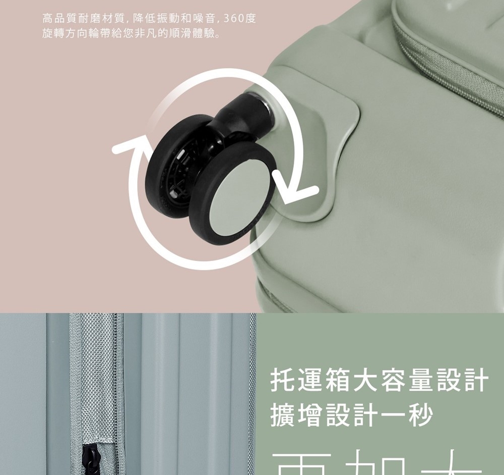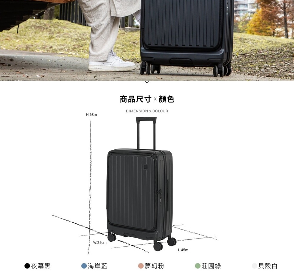 25吋旅行箱是長途旅行的好夥伴,可擴增拉鍊裝置設計,自由調整行李箱容量。箱底的把手凹槽設計,甚麼角度抬起行李箱都穩固又省力。