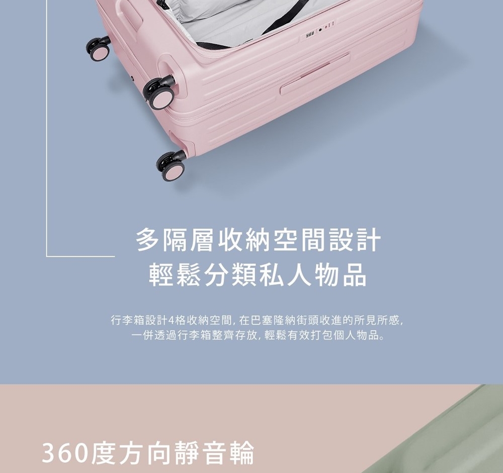 行李箱設計 3 格收納空間,在巴塞隆納街頭收進的所見所感,一併透過行李箱整齊存放,輕鬆有效打包個人物品。