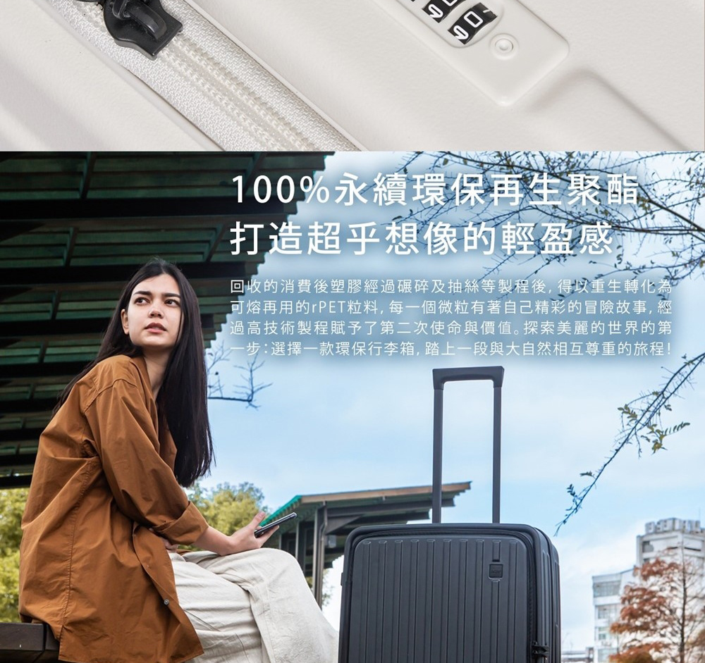 回收的消費後塑膠經過碾碎及抽絲等製程後,得以重生轉化為可熔再用的rPET粒料,每一個微粒有著自己精彩的冒險故事,經過高技術製程賦予了第二次使命與價值。探索美麗的世界的第一步:選擇一款環保行李箱,踏上一段與大自然相互尊重的旅程!