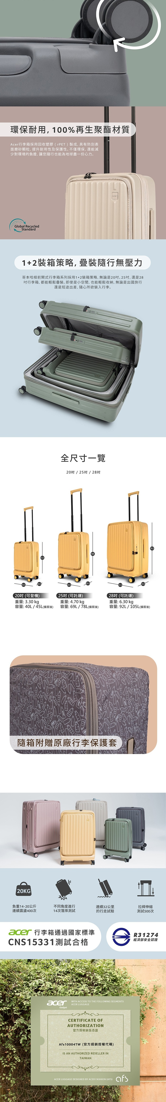 Acer行李箱採用回收寶特瓶(rPET)製成,具有防刮表面磨砂顆粒,提升耐用性及保護性。不僅環保,還能減少對環境的負擔,讓您隨行也能為地球盡一份心力。