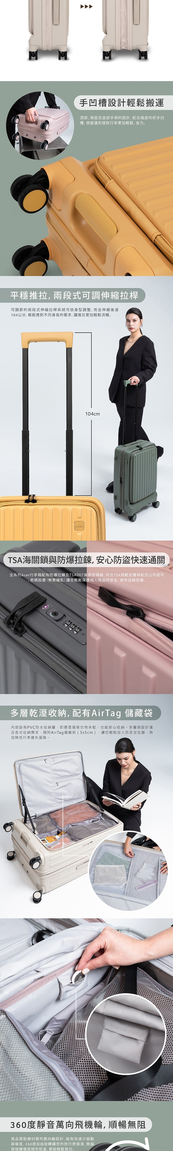 全系列Acer行李箱配有防爆拉鍊及TSA007海關密碼鎖,符合TSA規範並獲得航空公司認可,密碼設置(無需鑰匙)讓您輕鬆保護個人物品的安全,避免盜竊困擾。