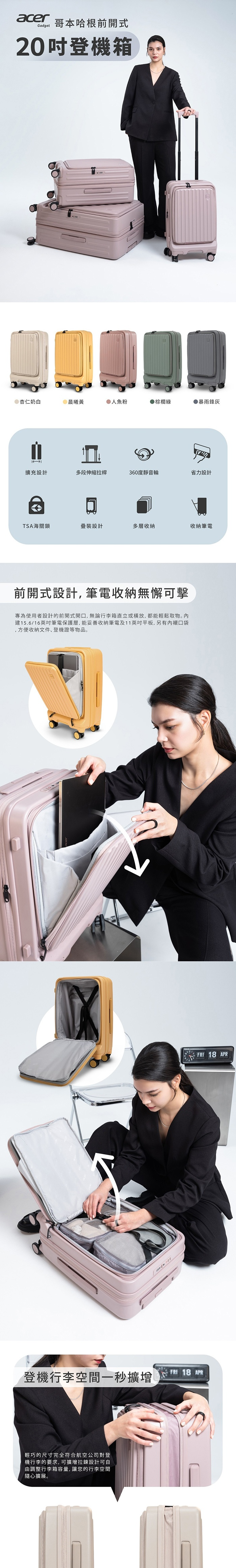 延續Acer行李箱前開式設計,哥本哈根系列行李箱,可收納一台15.6/16英吋筆電和11英吋平板,同時內襯夾層可放置文件或登機證。