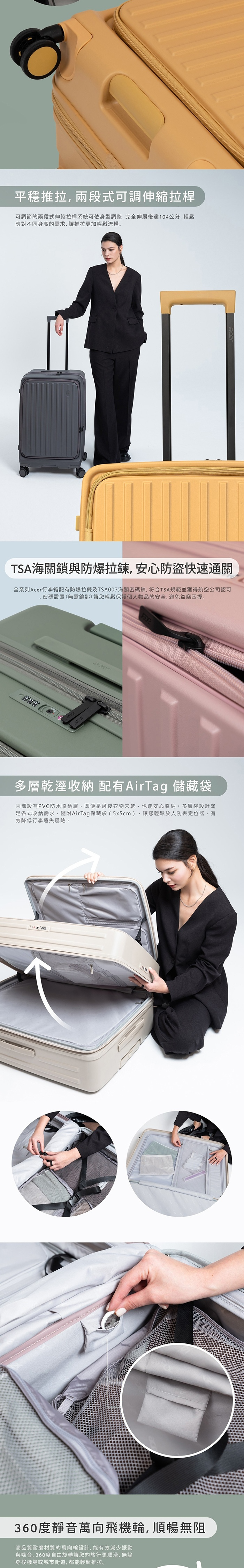 高品質耐磨材質的萬向輪設計,能有效減少震動與噪音,360度自由旋轉讓您的旅行更順滑,無論穿梭機場或城市街道,都能輕鬆推拉。