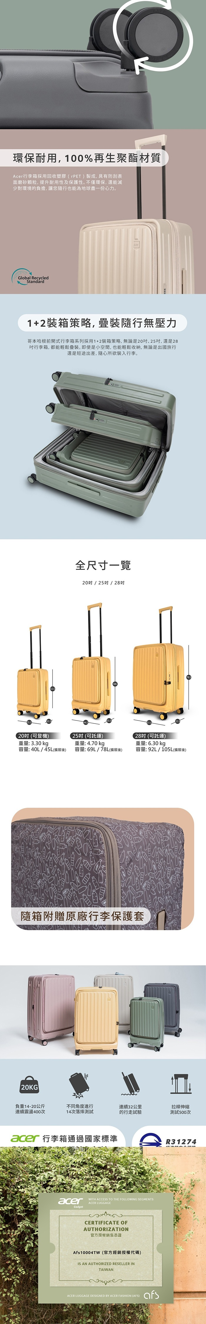 Acer行李箱採用回收寶特瓶(rPET)製成,具有防刮表面磨砂顆粒,提升耐用性及保護性。不僅環保,還能減少對環境的負擔,讓您隨行也能為地球盡一份心力。