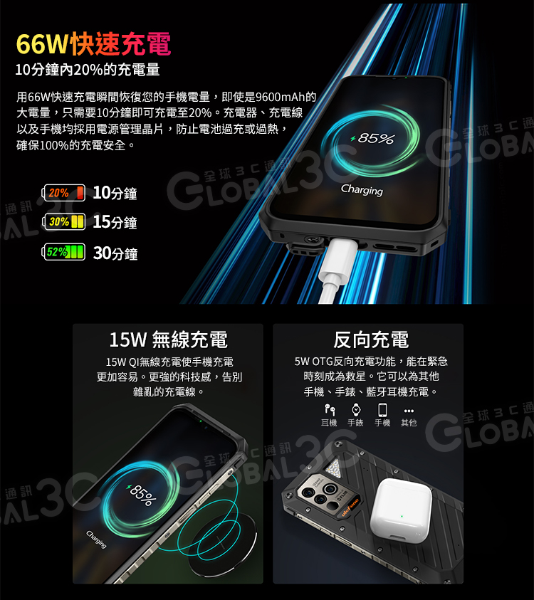 充電速度:66W快充、15W無線充電、5W無線反向充電
