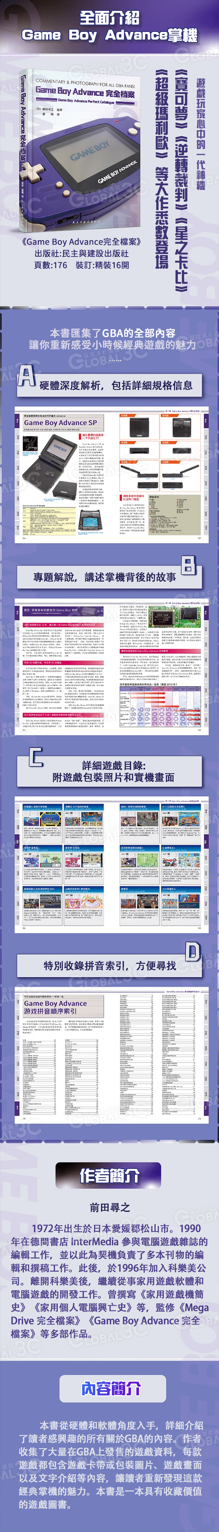 本書從硬體和軟體角度入手,詳細介紹了讀者感興趣的所有關於GBA的內容。作者收集了大量在GBA上發售的遊戲資料,每款遊戲都包含遊戲卡帶或包裝圖片、遊戲畫面以及文字介紹等內容,讓讀者重新發現這款經典掌機的魅力。本書是一本具有收藏價值的遊戲圖書。