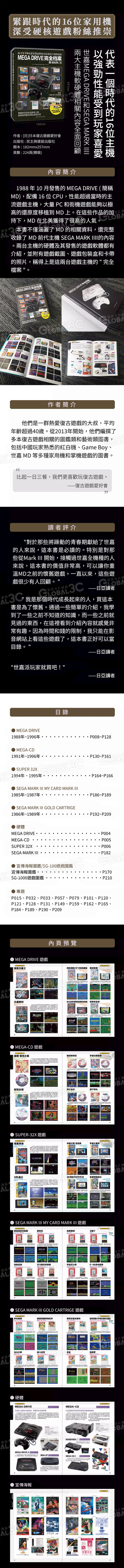 本書不僅涵蓋了 MD 的相關資料,還完整收錄了 MD 前代主機 SEGA MARK IIII的內容。兩台主機的硬體及其發售的遊戲軟體都有介紹,並附有遊戲截圖、遊戲包裝盒和卡帶的照片,稱得上是這兩台遊戲主機的 " 完全檔案 "。