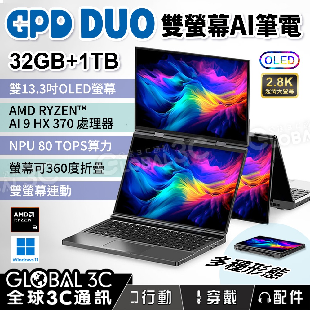 配件 : GPD DUO*1、100W PD充電器*1、USB-C快充線*1、保固卡*1、說明書*1