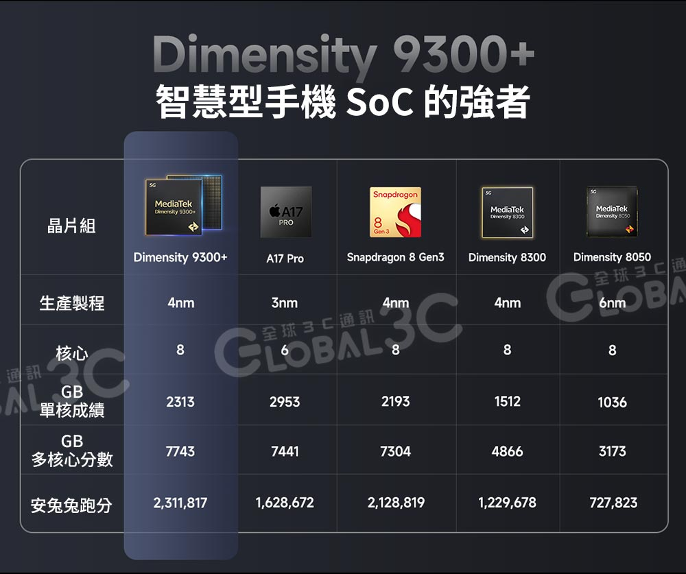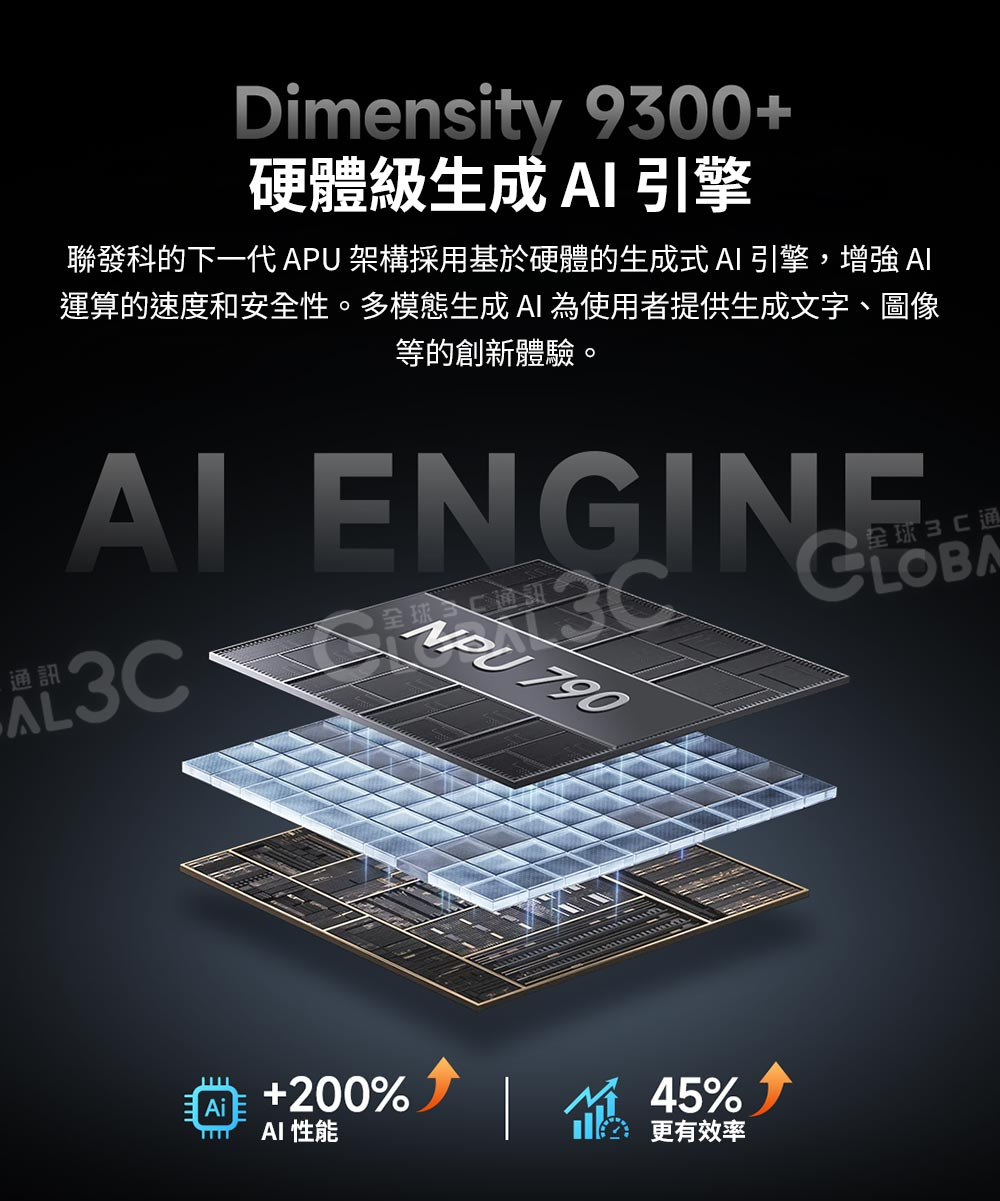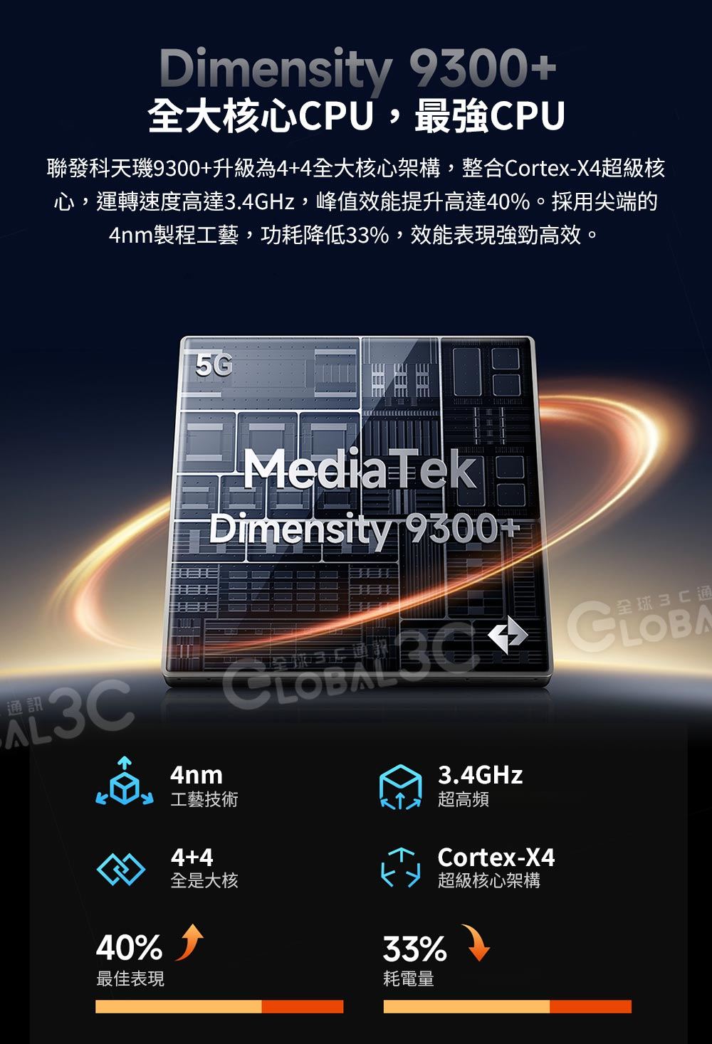 ➤聯發科天璣9300+升級為4+4全大核心架構,增強 AI 運算的速度和安全性