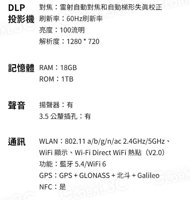 - 對焦:雷射自動對焦和自動梯形失真校正