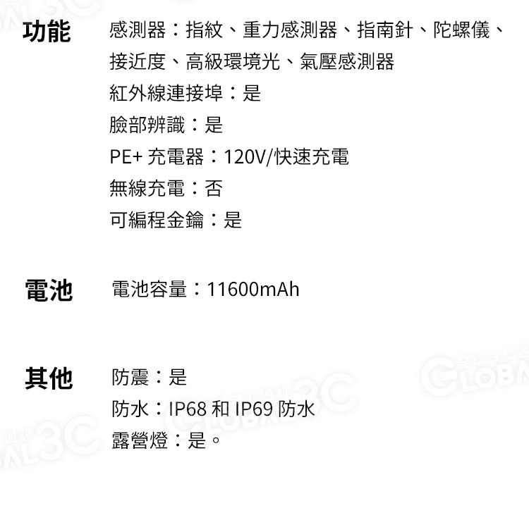 - 感測器:指紋、重力感測器、指南針、陀螺儀、接近度、高級環境光、氣壓感測器