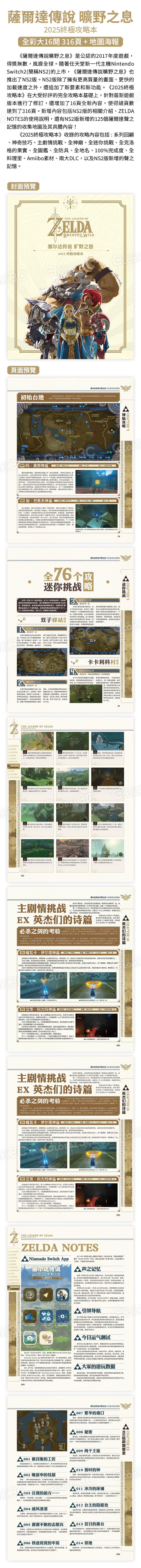《2025終極攻略本》收錄的攻略內容包括 : 系列回顧、神奇技巧、主劇情挑戰、全神廟、全迷你挑戰、全克洛格的果實、全圖鑑、全防具、全地名、100%完成度、全料理里、Amiibo素材、兩大DLC,以及NS2版新增的聲之記憶。