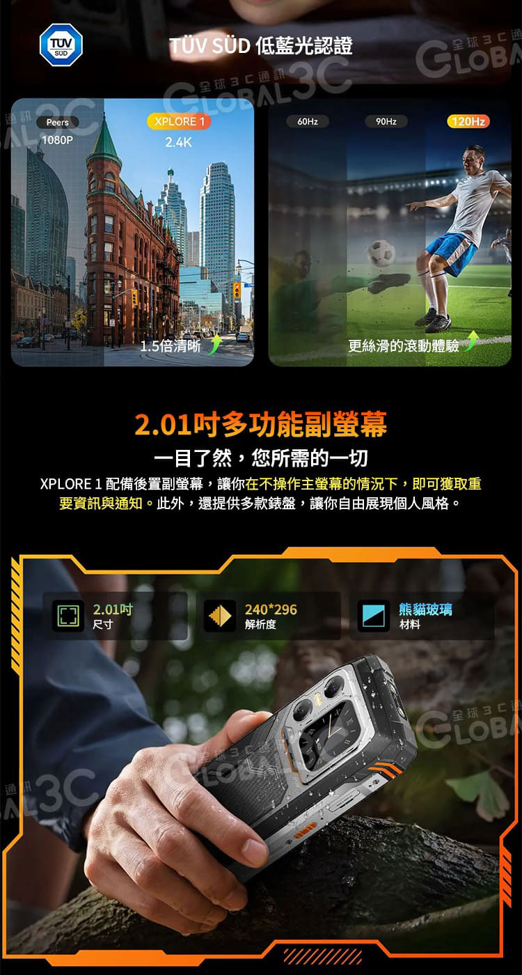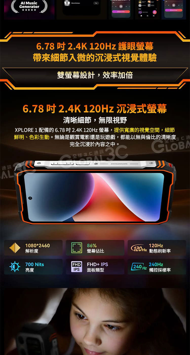 主螢幕 : 6.78 吋 2.4K FHD+IPS,1080×2460解析度,康寧大猩猩玻璃5,120Hz刷新率