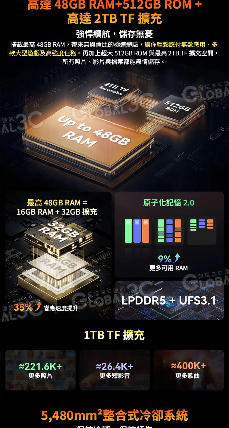 RAM和ROM : 32GB (16+32) RAM 和 512GB ROM,LPDDR5+UFS3.1