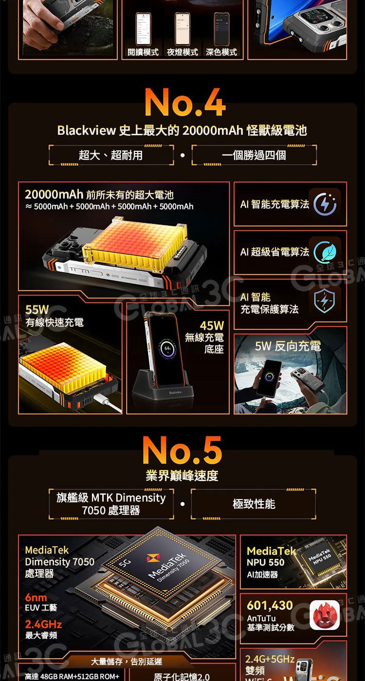 ➤搭載20,000mAh巨型電池,支援 55W 快速充電,續航力持久、充電效率高