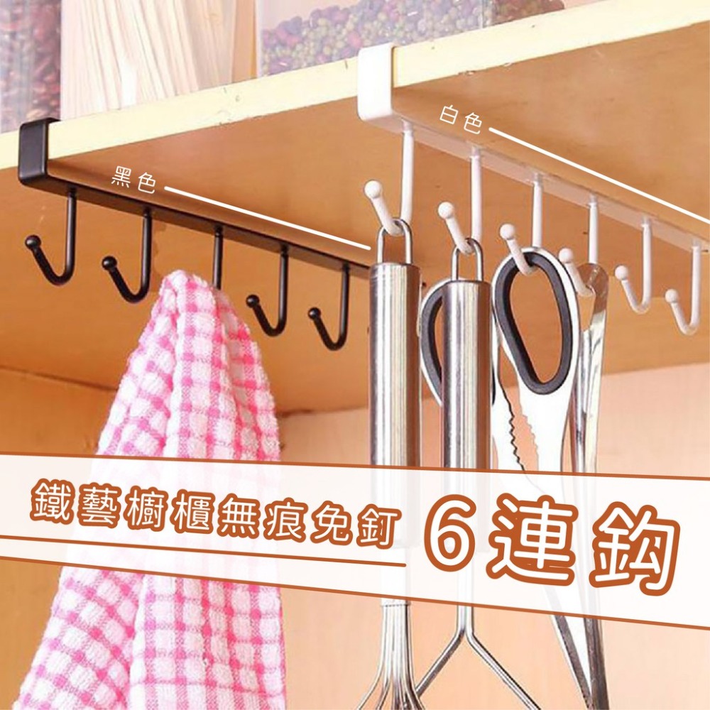 名稱:廚房無痕免釘掛鈎6連鈎 顏色:鐵藝6連掛鈎黑色、鐵藝6連掛鈎白色 材質:ABS+鐵絲 最大承重:5kg 款式:三個以上排鈎