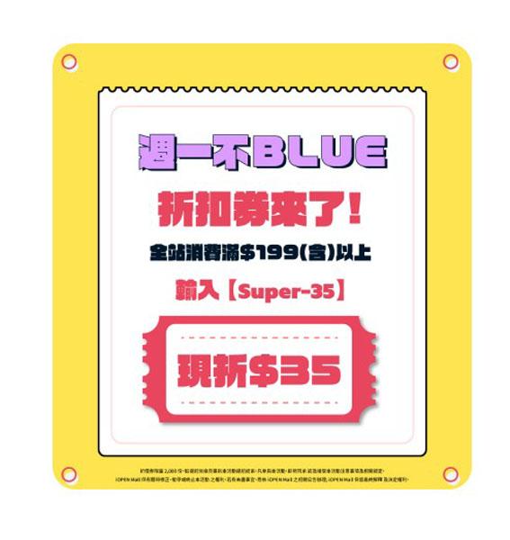 <p><b><font color="#000000" style="background-color:rgb(255,255,0)&#59;">週一不BLUE 折扣券來了</font></b></p><p>全站消費滿<span style="background-color:rgb(250,250,250)&#59;color:rgb(51,51,51)&#59;font-family:'Helvetica Neue', helvetica, arial, 'WenQuanYi Zen Hei', 'Hiragino Sans GB', 'LiHei Pro', 'Heiti TC', 'Microsoft JhengHei UI', 'Microsoft JhengHei', 'san-serif'&#59;font-size:14px&#59;">$199元以上,輸入</span><span style="font-family:'-apple-system', BlinkMacSystemFont, 'Segoe UI', Roboto, 'Helvetica Neue', Arial, 'Noto Sans', sans-serif, 'Apple Color Emoji', 'Segoe UI Emoji', 'Segoe UI Symbol', 'Noto Color Emoji'&#59;font-size:1rem&#59;">「Super-35」,現折</span><span style="background-color:rgb(250,250,250)&#59;color:rgb(51,51,51)&#59;font-family:'Helvetica Neue', helvetica, arial, 'WenQuanYi Zen Hei', 'Hiragino Sans GB', 'LiHei Pro', 'Heiti TC', 'Microsoft JhengHei UI', 'Microsoft JhengHei', 'san-serif'&#59;font-size:14px&#59;">$</span><span style="font-size:1rem&#59;font-family:'-apple-system', BlinkMacSystemFont, 'Segoe UI', Roboto, 'Helvetica Neue', Arial, 'Noto Sans', sans-serif, 'Apple Color Emoji', 'Segoe UI Emoji', 'Segoe UI Symbol', 'Noto Color Emoji'&#59;">35</span></p><p><font face="-apple-system, BlinkMacSystemFont, Segoe UI, Roboto, Helvetica Neue, Arial, Noto Sans, sans-serif, Apple Color Emoji, Segoe UI Emoji, Segoe UI Symbol, Noto Color Emoji">活動期間:8/7(一)00:00-</font><span style="font-family:'-apple-system', BlinkMacSystemFont, 'Segoe UI', Roboto, 'Helvetica Neue', Arial, 'Noto Sans', sans-serif, 'Apple Color Emoji', 'Segoe UI Emoji', 'Segoe UI Symbol', 'Noto Color Emoji'&#59;font-size:1rem&#59;">8/7(一)23:59</span></p><p><span style="font-family:'-apple-system', BlinkMacSystemFont, 'Segoe UI', Roboto, 'Helvetica Neue', Arial, 'Noto Sans', sans-serif, 'Apple Color Emoji', 'Segoe UI Emoji', 'Segoe UI Symbol', 'Noto Color Emoji'&#59;font-size:1rem&#59;">(每個會員限使用一次!)</span></p>