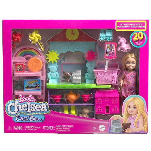 芭比小凱莉玩具店組合有20個講故事的配件,包括一個購物籃、收銀台、迷你芭比娃娃,和迷你UNO®遊戲等等。物品可以在彩色貨架和展示櫃檯上展示。