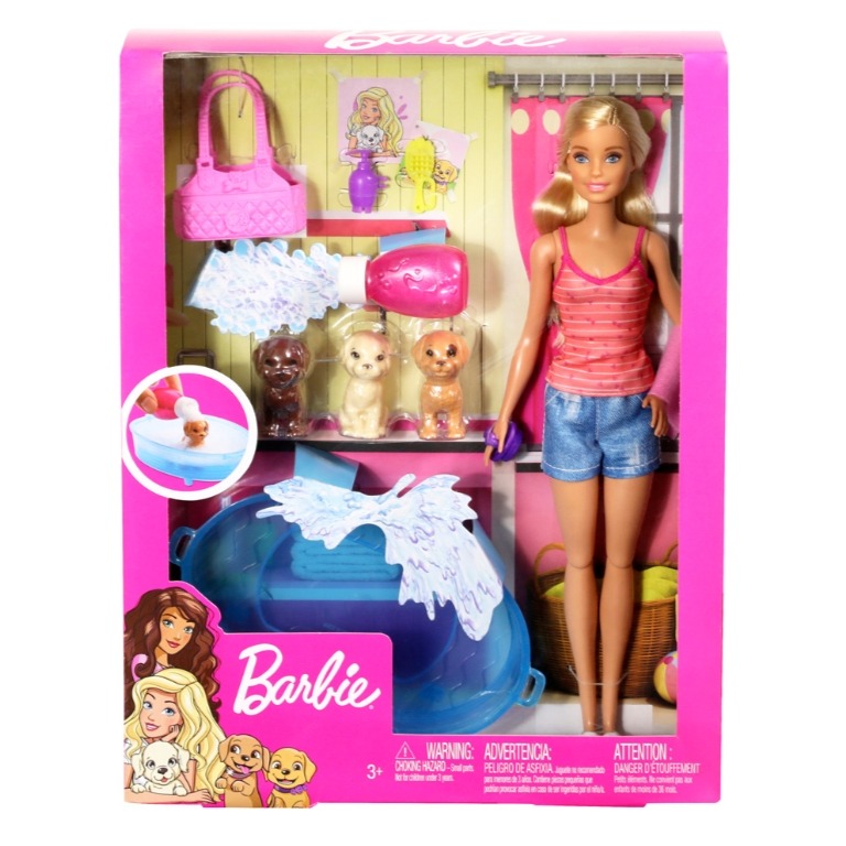 芭比娃娃喜歡所有的動物,尤其是小狗。她有三個可愛的毛小孩需要照顧——牠們已經準備好洗澡了!孩子們會喜歡幫芭比娃娃幫這些狗狗洗澡,她有一個浴缸、一個兒童尺寸和一個娃娃尺寸的肥皂瓶、一條毛巾、兩把刷子和一個寵物籠,讓孩子們可以玩各種美容遊戲!在浴缸中裝滿水,並在兒童尺寸的瓶子中裝滿泡泡水(不含在商品內),然後用它給小狗洗個泡沫浴,真正讓玩耍時濺起水花!芭比娃娃的膝蓋彎曲,呈現出逼真的效果,有些部件還帶有芭比娃娃可以握住的手柄,體驗角色扮演的樂趣。動物愛好者會想收養小狗並玩耍一整天。娃娃無法獨自站立。顏色和裝飾可能有所不同。