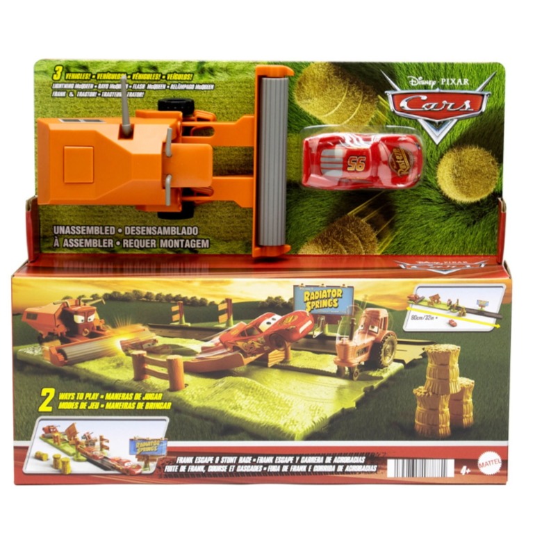 弗蘭克逃脫和特技賽車玩具套裝採用三輛角色汽車來重現迪士尼和皮克斯的《汽車總動員》標誌性場景之一,是一種與喜愛的角色一起玩耍的激動人心且充滿動作的方式。請記住,在弗蘭克出現之前,拖拉機傾倒都是充滿樂趣的遊戲!這套裝有兩種易於設定的配置:Frank Escape 和 Stunt Race。在弗蘭克逃脫模式下,閃電麥坤將直線移動以躲避追趕他的弗蘭克車輛,並在此過程中撞倒一輛不起眼的拖拉機等等。特技競賽模式設置了一個坡道,可以跳過乾草堆並逃離憤怒的聯合收割機。