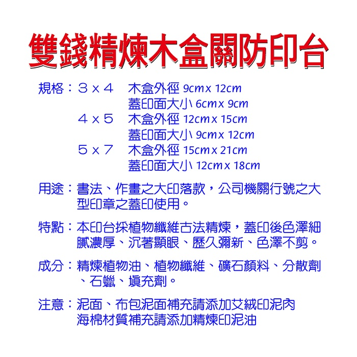 特點:本印台採植物纖維古法精煉,蓋印後色澤細膩濃厚、沉著顯眼、歷久彌新、色澤不減。