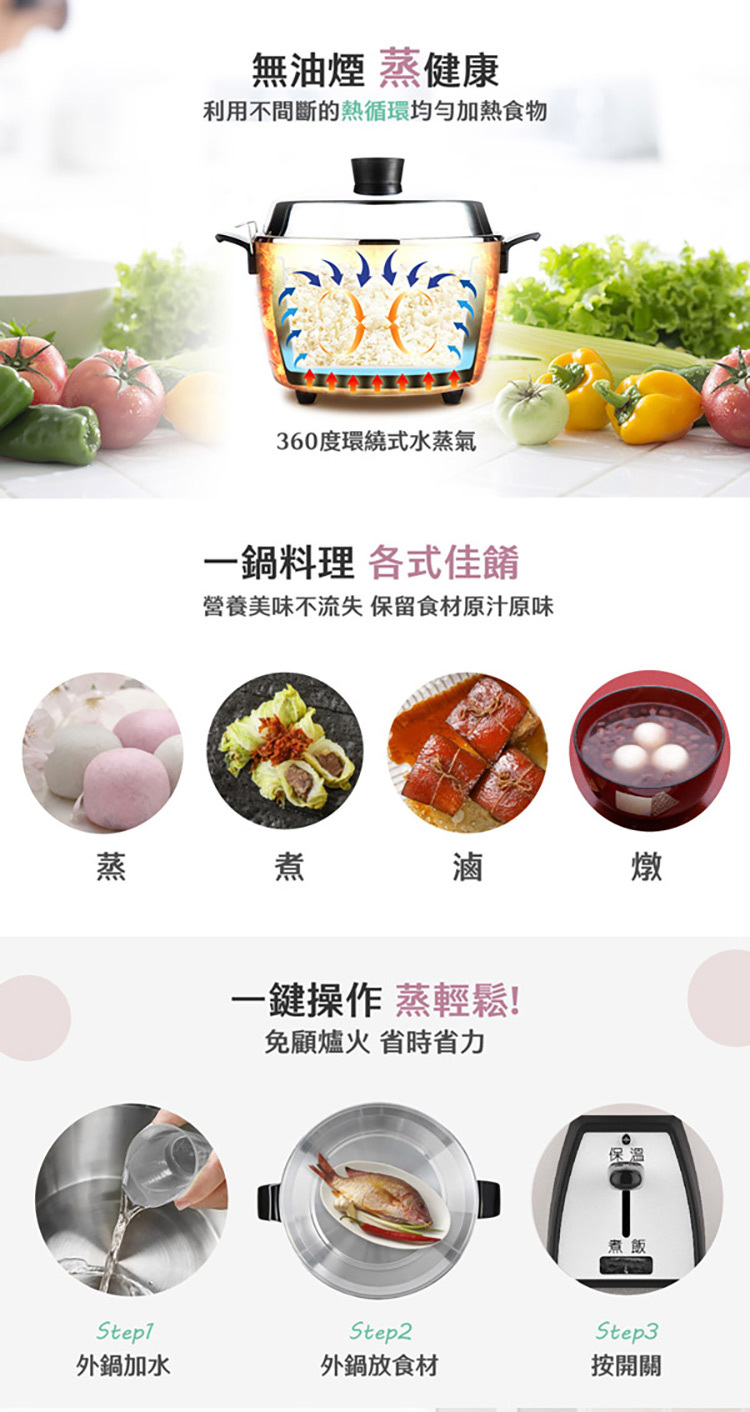 • 外鍋、外鍋蓋、內鍋、內鍋蓋、蒸盤皆為SUS304不鏽鋼