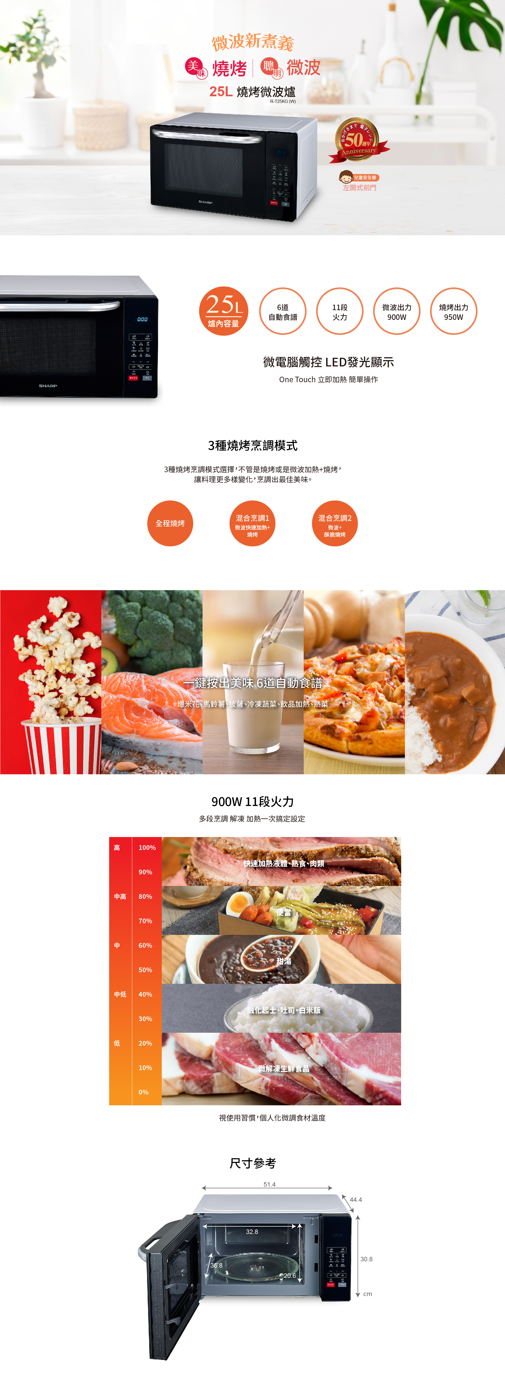 • 25公升(黑色) 微波900瓦,950W超強燒烤加熱, 11段火力,6道自動食譜,混和烹調、解凍、加熱、全程燒烤、輕鬆設定,微電腦觸控LED發光顯示,一般微波解凍・重量解凍,兒童安全鎖
