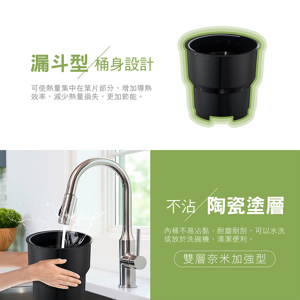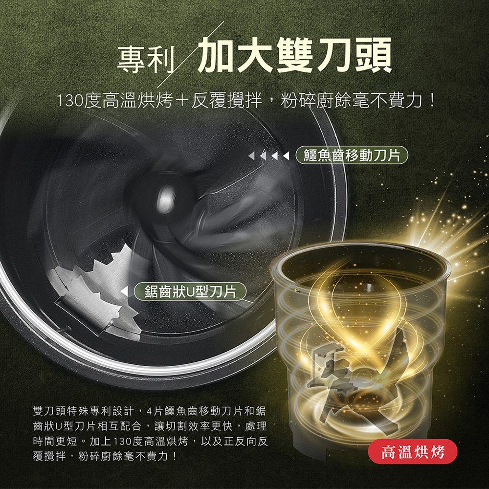 • 專利結構,雙刀片設計,切割效率更快,將廚餘徹底粉碎,處理時間更短