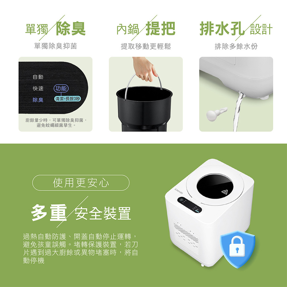 • 獨立除臭設計,在廚餘量少時可單獨除臭抑菌,避免孳生蚊蠅細菌