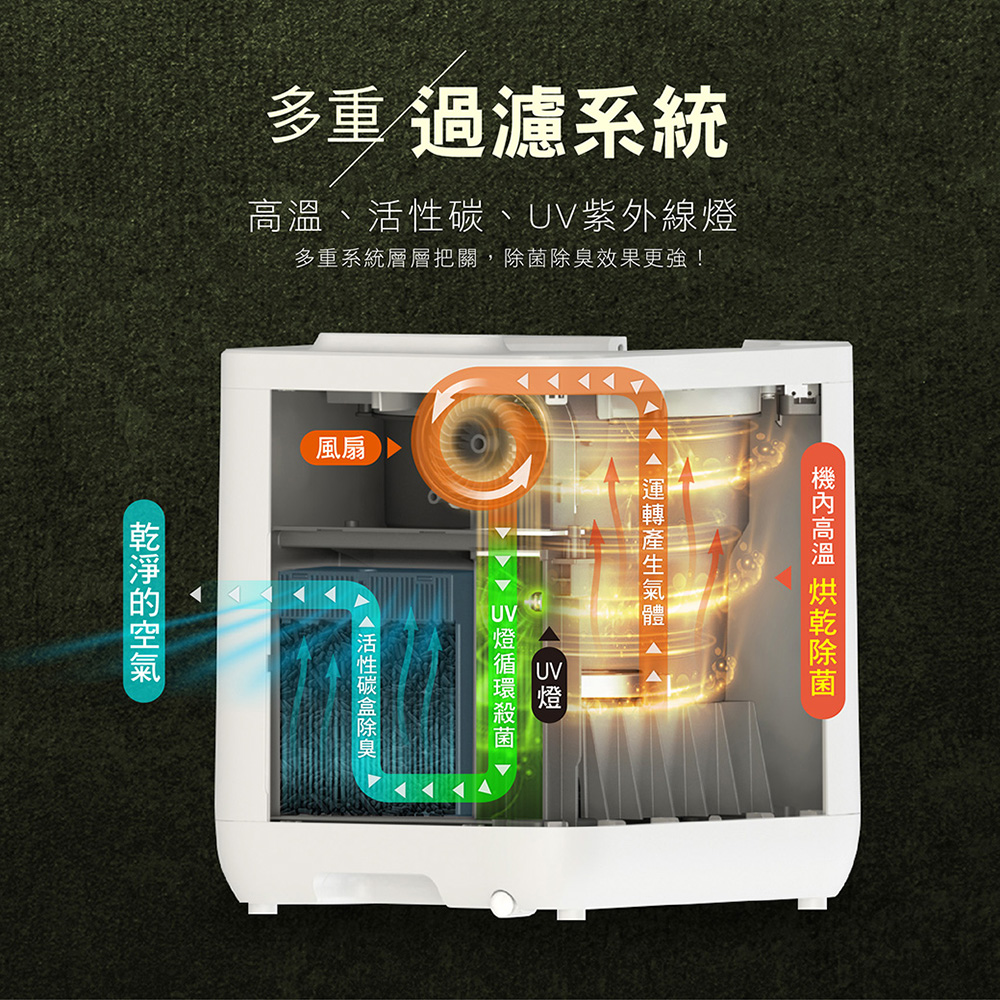 • 多重過濾系統,高溫、活性碳、紫外線多重系統,除菌除臭更安心