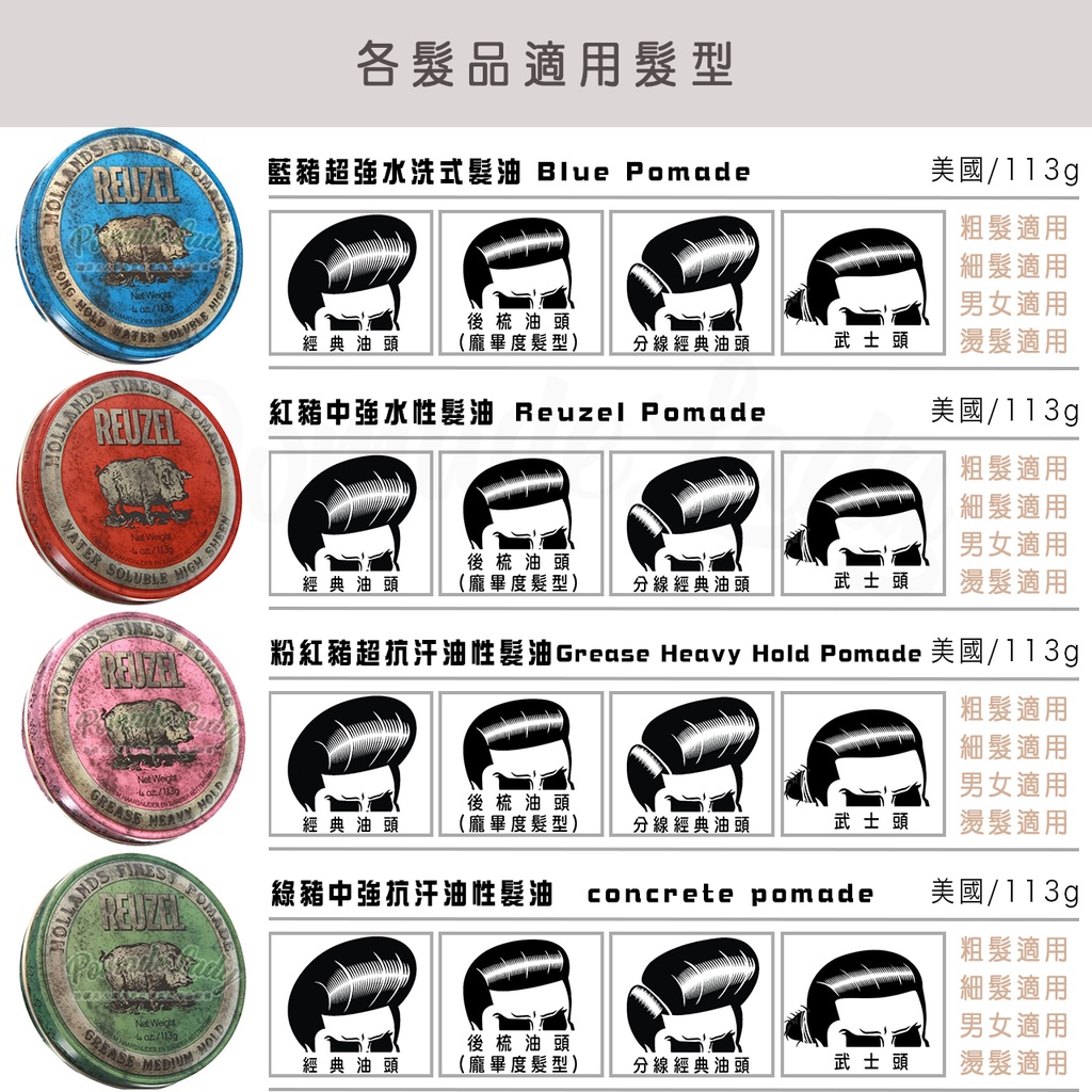 已經可以用荷蘭名產來形容得Reuzel 粉紅豬油性髮油可說是當家的明星產品。利用多年開發得綠豬成分做基底,經過團隊不斷嘗試各種調配工法,實現了這款,可以說是超越各大髮油的超強的油性髮油,定型力極強可以防汗抗潮,一整天不會揮發水解,不管怎麼動,風怎麼吹都不會變形,且輕鬆再次梳出紋理緊實的線條感造型,是目前油頭使用者絕不陌生的一款髮油,讓你一用就驚呼它的造型力!