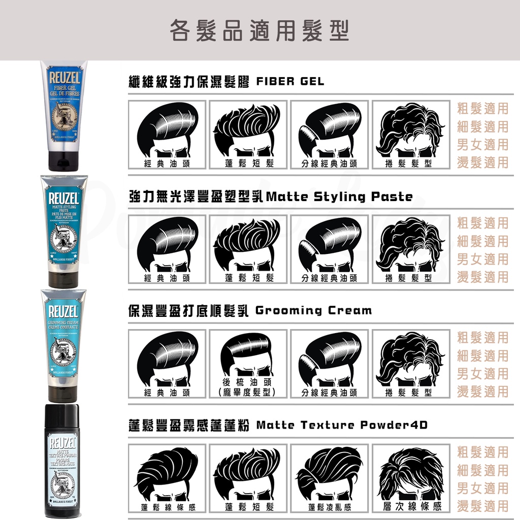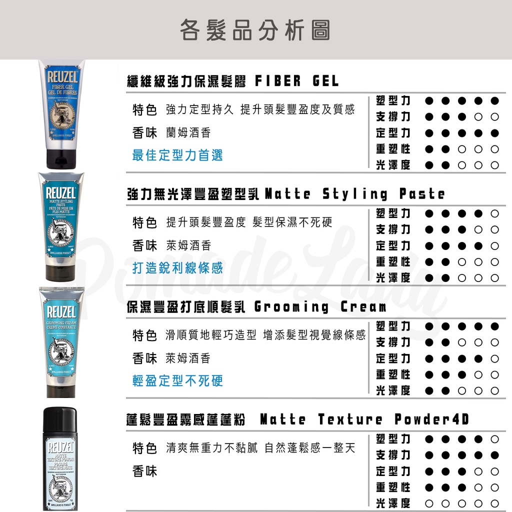 Reuzel系列旗下推出的第一款髮膠產品,Fiber Gel纖維式彈力髮膠!與市售常見造型髮膠不同的事,萃取植物性纖維素,在收乾過程中不會帶來硬化效果,讓髮型保有韌性,有效撫平分叉頭髮,並且發揮髮型二次塑性的效果,當中不含酒精成分,降低對頭髮的傷害,中低光澤感,當中飄有蘭姆酒香氣,彷彿置身於加勒比海之中,供所有男性們參考。