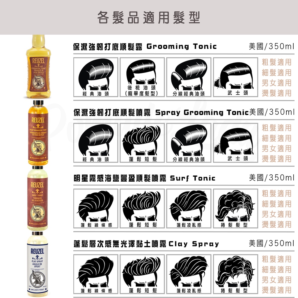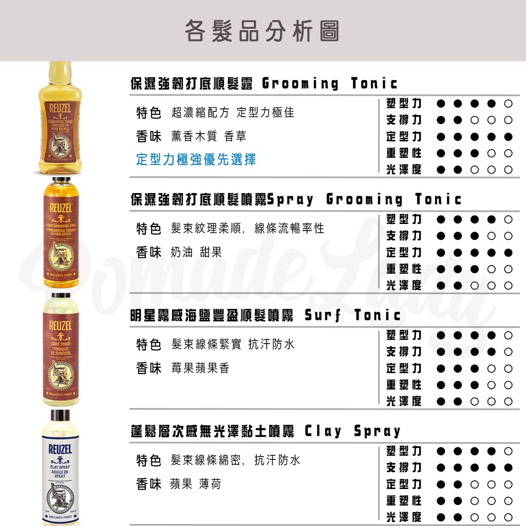 如今已穩坐全球男性造型品牌地位的Reuzel,靠著製作團隊獨家打造的Grooming Tonic造型順髮液,讓它在男性造型品之中佔有不可或缺的重要腳色,不僅具有抗熱以及保濕作用,吹整的同時還擁有軟化頭髮的功能,抑制頭髮毛燥,吹髮之間更柔順簡單,為此Reuzel在今年再度推出Spray的噴頭式設計,直接針對頭髮進行噴灑,能夠縮短使用者在造型過程的時間,又能快速將髮型一次整理到位,最終能賦予頭髮定型及蓬鬆感,在搭配任一款髮油,髮型表現更為出色,可說是專為男性量身訂做的造型打底順髮噴霧