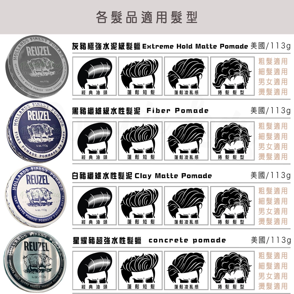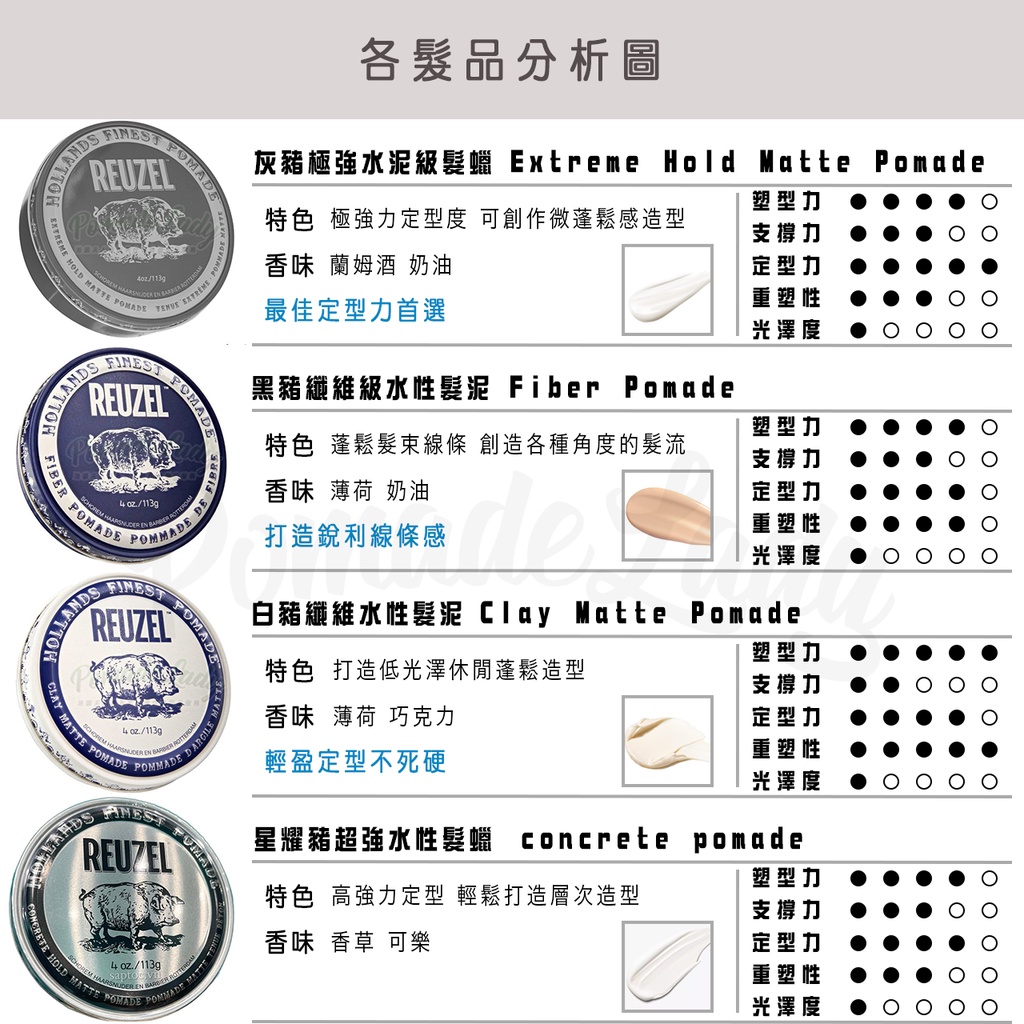 Reuzel為了解決部分男士對於定型力要求等因素,今年再度推出的全新產品。Extreme Hold 灰豬,運用先前的水溶性配方調教,將黏度提高並改良濃縮,卻讓質地仍然保有原始的滑順感,本次主打的定型力,也發揮它的驚人持久力效果,不論是微凌亂感,或是手撥經典油頭,都能輕易辦到,可說Reuzel新世代的主力戰將。