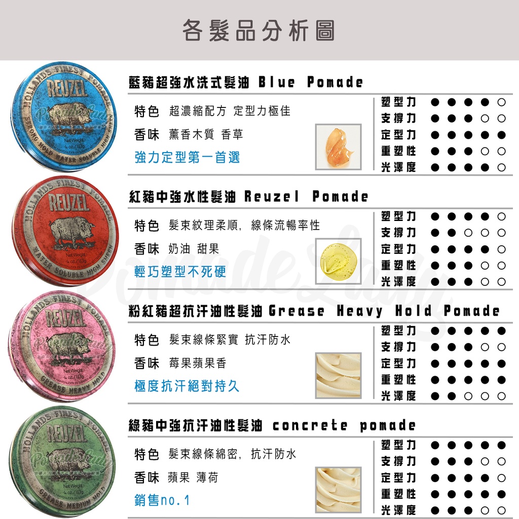 荷蘭國家隊最具代表性的造型品牌,Reuzel為旗下開發出第一款產品Green Pomade Grease綠豬油性髮油經典款,而綠豬可說是當代最重要的,一款巨作,銜接傳統工法,注入獨家配方,同時加入懷舊的濃濃蘋果薄荷香,深深喚起許多男士們心中的經典造型魅力,而優良的定型力表現,有效抵抗,高溫氣候,發表至此已獲得許多人的青睞