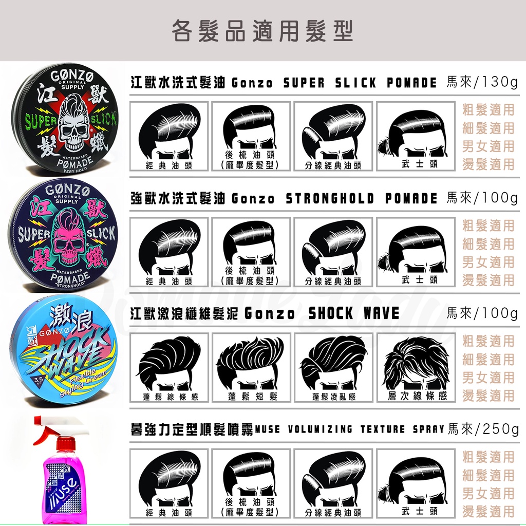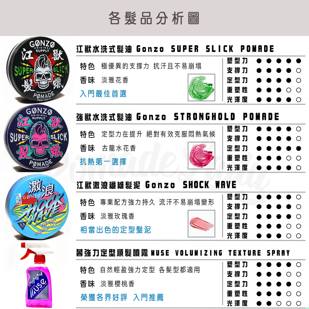 為了解決水性髮油在亞洲地區遇熱崩塌的困擾 江獸Gonzo特地與日本共同研發製作,第一款具備抗熱配方的Gonzo Super Slick Pomade江獸水性髮油,精心調配的叢林綠的水潤質地,使操控感更是得心應手,收乾具有適中的硬化效果,而定型力表現完全發揮它強大的效果,香調選用百合花香,彷彿置身在海島國家般的感受,絕對可以說是亞洲新世代的一款強大水性髮油。