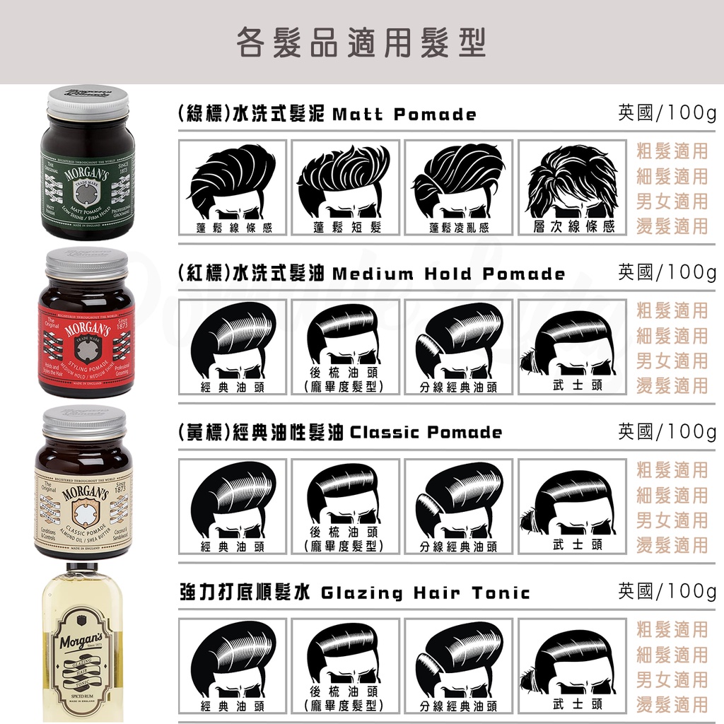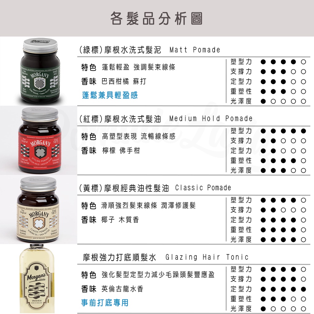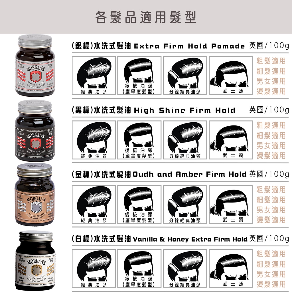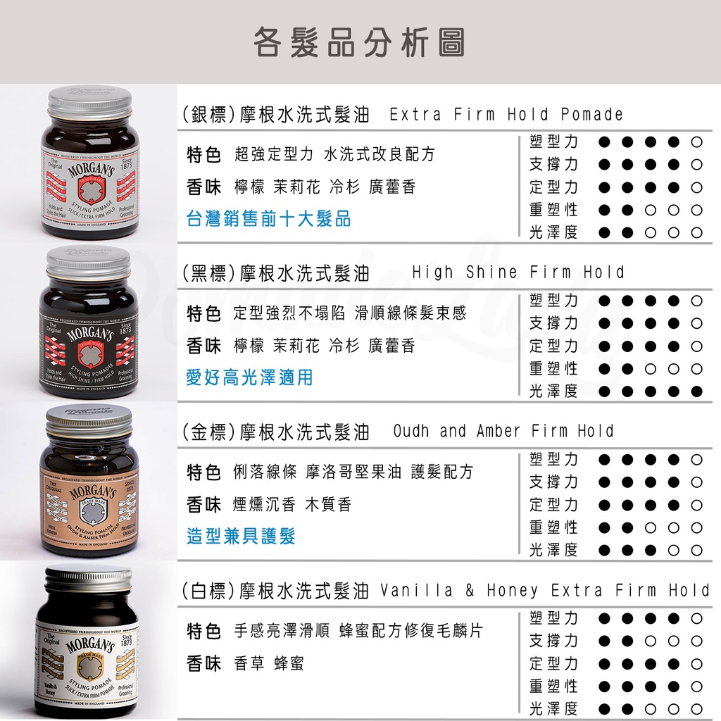 由摩根一手改良研發的Extra Firm Hold強力水洗髮油(銀標),秉持著髮油的高品質,堅持小量生產,質地水潤,輕鬆塑造各式線條感,改良的獨特配方,有效提升更長久的定型效果,特別添加茉莉花及廣藿香香料,味道清新淡雅,搭配復古懷舊的包裝質感,相當受到廣大消費者喜歡!