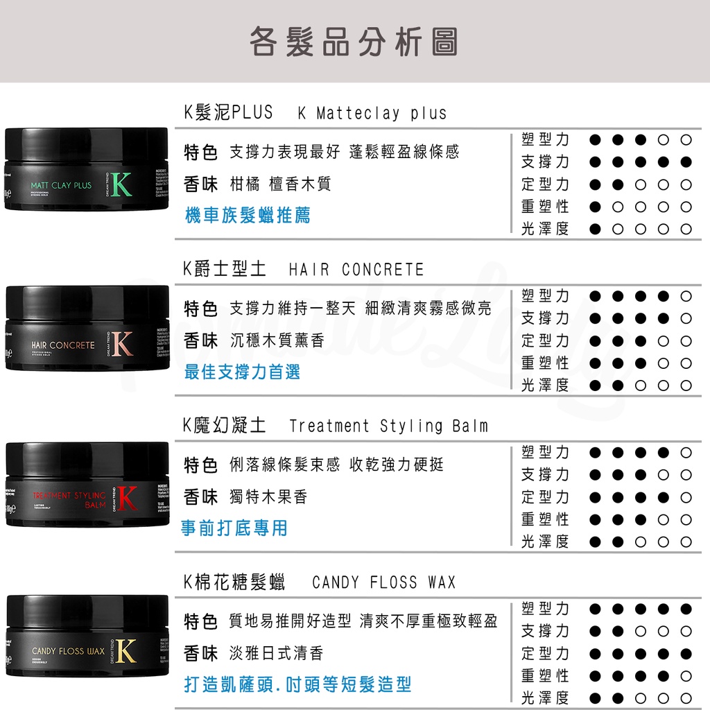 為了解決塑型力不佳的缺憾,K系列找來日本集團合作開發的K魔幻凝土,利用生技科技導入了海泥等全新配方,造型過程中還有深層護髮效果。中高黏度的支撐力表現,塑型力輕鬆整理,定型力效果更是卓越持久。清新的木果香氣不刺鼻,相當舒服,也是目前相當受到網友們歡迎的一款!