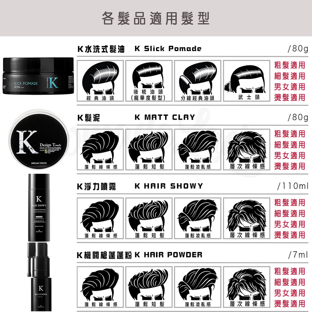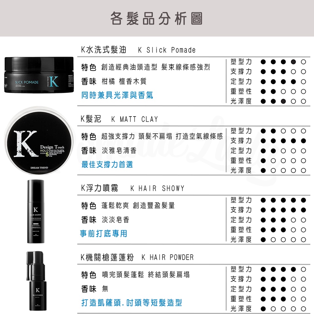2015年初K系列所推出的第一款K髮泥造型品,透過各大媒體及部落客、藝人開箱推薦使用。水泥綠色澤的質地,實際上的手感表現相當強黏,能夠達到很好的支撐力效果,造型後的抗汗表現也是相當驚人,無光澤感,且相當乾爽自然對於抓較高支撐力的使用者或是飛機頭造型都非常適合。目前可以說是網路訂單量最高的一款造型品!