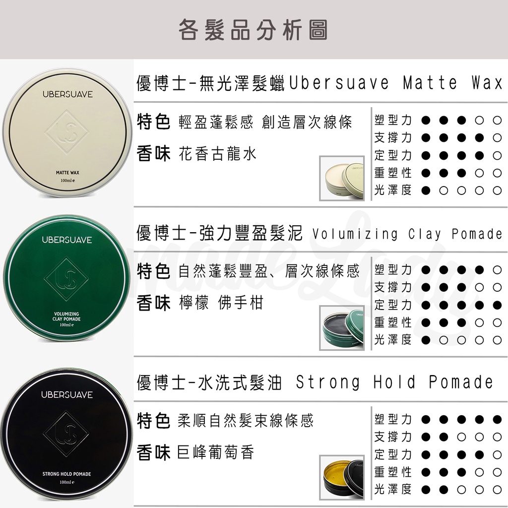 新加坡UBERSUAVE(優博士),歷經多年耕耘,現已成為東南亞最具實力派的造型品牌,近期全新改版升級的Matte Wax無光澤髮蠟,改良了高嶺土配方,不只可以吸附頭髮油脂,髮型更為清爽,擺脫雜牌髮蠟的黏膩感,並且可以做到高支撐力效果,讓髮束感更鮮明銳利,此款相當適合台灣使用者適用!