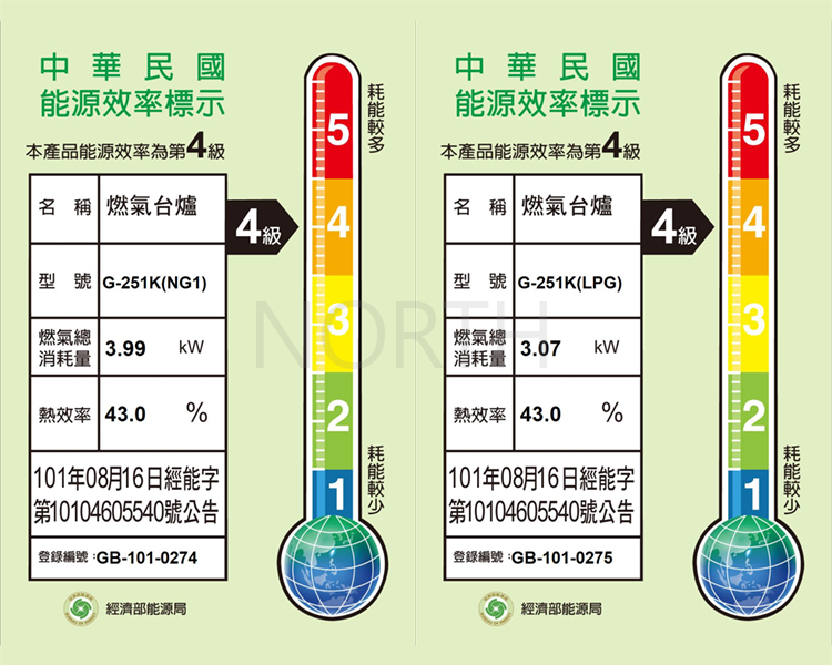 熱效率 | 液化瓦斯 | 43% (能源效率第 4 級) |