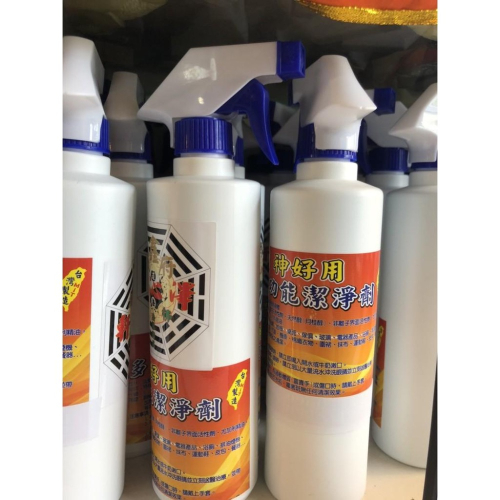 ◆◆超取:小瓶一單最多7瓶,大瓶一單最多一瓶 (超過則麻煩分兩單或是選擇宅配) 神好用 萬用清潔劑 大瓶:(2800元)(可以分補充8瓶小瓶) 小瓶500cc (400元) 清理神壇 大掃除整棟房子 即將迎接新年! 但是囤積一年的油垢都讓我們頭痛 不用緊張 有了神好用一切都輕鬆! 清洗 神桌 後貼 神衣 銀帽 銅帽 紙帽 汽車 機車 廚房廁所。家具 鞋子 衣服 鍋具等..... 都可以使用 (保証不傷手 不傷漆) (台灣製作 檢驗合格) (以下是使用前後效果的照片) ◆◆◆ 內含成分 特殊非離子活性劑 天然醇(月桂醇) 非離子界面活性劑 尤加利精油 ◆◆◆ ◆◆ 台灣製造 ◆◆ ◆◆ 合格認證 ◆◆ ◆◆使用方法 (衣服) 清潔劑噴上去之後 用一盆水戶搓 免用刷子清洗 ◆◆使用方法 清潔劑噴上去之後 用濕抹布直接擦拭 免用刷子清洗 ◆ 可洗沾血的衣物 ◆ 可洗油垢 汙漬 ◆ 可洗小寶寶衣物 ◆ 可洗神明衣帽 銅 紙類 ◆ 可洗 白色衣物 ◆ 可洗 布鞋 運動鞋 皮包 餐器 ◆ 可洗家具 玻璃 電器產品 ◆ 可洗浴室 排油煙機 瓦斯爐 洗衣機 ◆ 可洗汽車 機車 防潑水功能