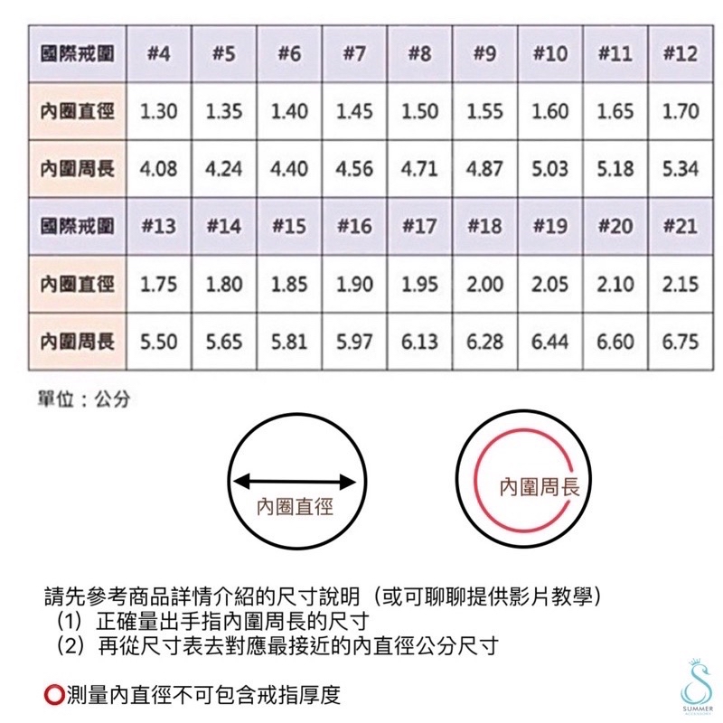 貼心叮嚀:請用細線或薄紙片測量,如不會量戒圍可先聊聊諮詢提供教學影片喔^_^