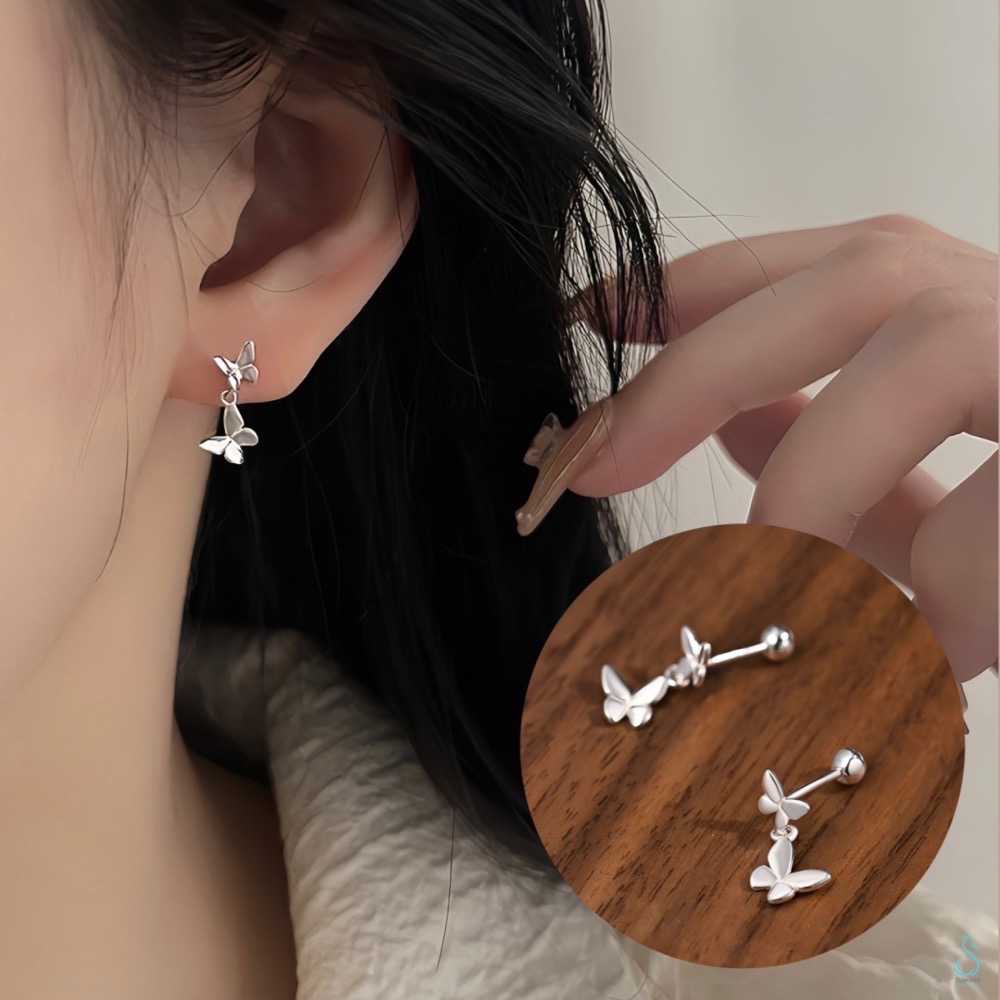 ✨這款耳環最大的特色在於其精巧可愛的雙蝴蝶造型。兩隻小巧的蝴蝶以懸掛式設計,營造出輕盈靈動的視覺效果,彷彿蝴蝶在耳畔翩翩起舞。