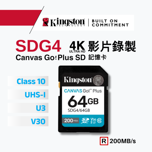 金士頓 Canvas Go!Plus 64GB SD 記憶卡 V30 U3 4K 連拍模式攝影 SDG4
