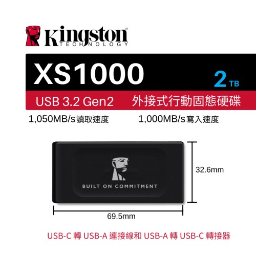 金士頓 XS1000系列 2TB TypeC to TypeA 外接式固態硬碟 SSD 黑色 (五年保固)